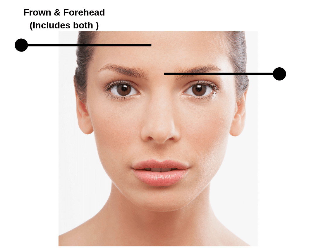 The forehead and frown are considered “One and a half areas” and require 32 units of Botox to be effectively treated.